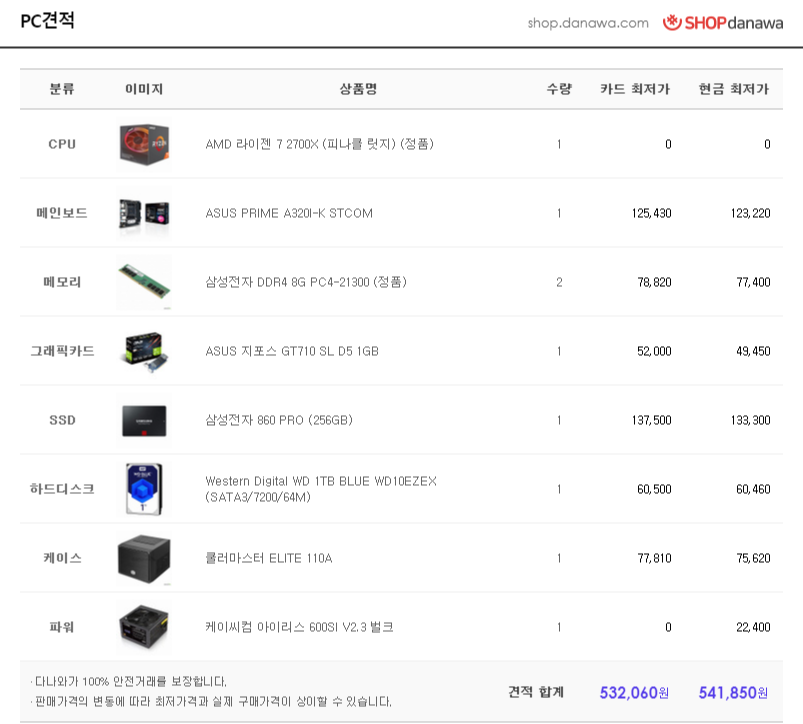 - 현재 보유한 CPU / SSD / HDD / 파워를 제외한 가격 : 391,570 원 (-72,860 원)