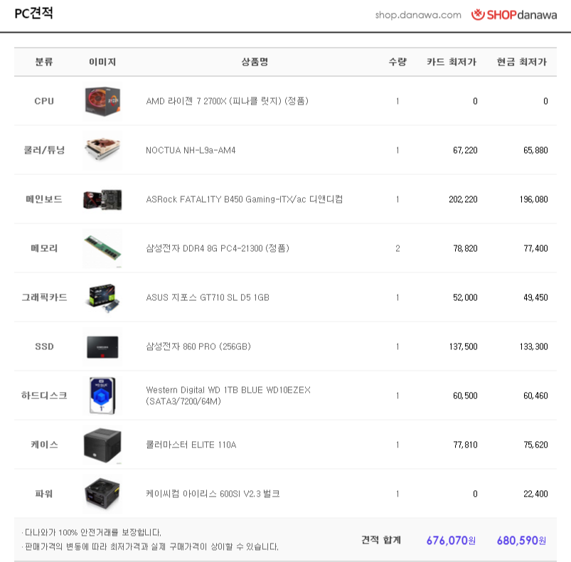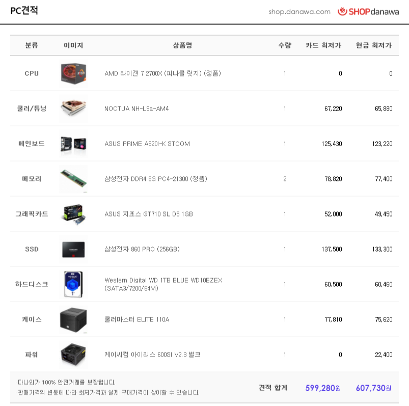 - 기존에 보관중인 Ryzen 7 2700x을 적용한 견적.